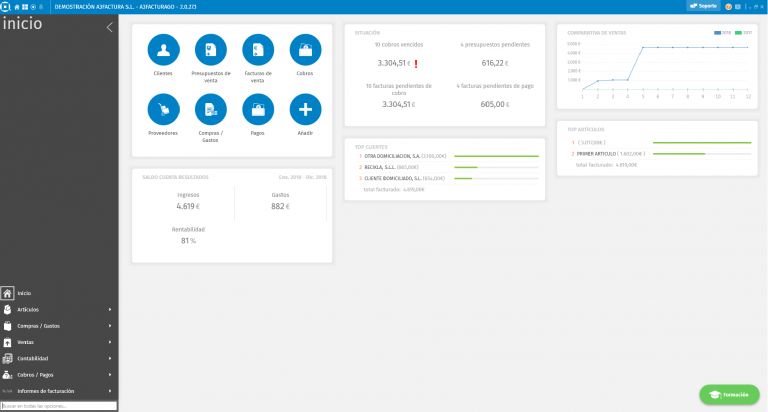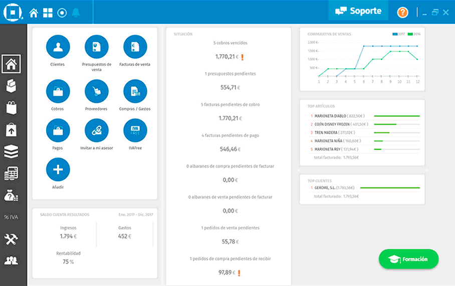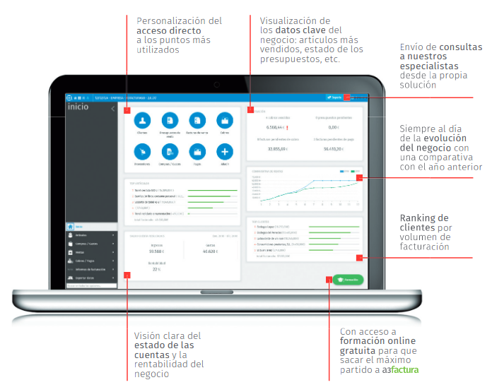 a3factura centraliza la gestión de tu negocio. Tendrás bajo control tus cobros y pagos, las estadísticas de ventas que necesitas y el porcentaje de rentabilidad.